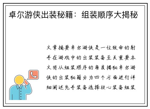 《高达无双中文版免费下载及安装教程全攻略》是一篇为广大玩家提供详细高达无双游戏下载与安装指导的文章,旨在帮助玩家轻松享受机战游戏带来的乐趣。本文从四个方面详细介绍了高达无双中文版的下载安装流程、安装注意事项、游戏设置以及优化技巧。通过这些内容,玩家可以在自己的电脑或主机上顺利运行游戏并获得最佳的游戏...